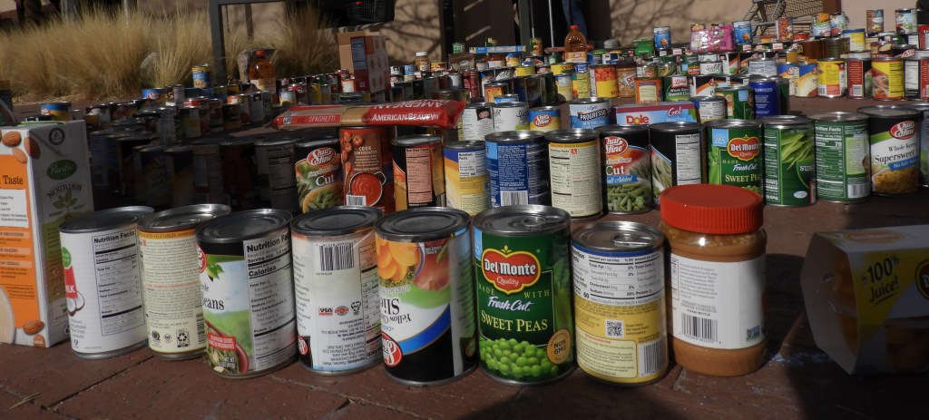 On Saturday, Nov 16th, the Labyrinth Resource Group hosted a Canned Food Drive at the Eldorado Supermarket…..with a twist! As shoppers brought their donations from the store, they placed them on the patio along the lines of a chalk labyrinth. In the end, 405 cans created a beautiful canned food labyrinth! The donations were boxed and delivered to Bienvenidos Food Pantry to help feed hungry souls in Santa Fe. Our thanks to Eldorado Supermarket and Bienvenidos, and especially the shoppers for making this event a great success. We hope to make this an annual event!