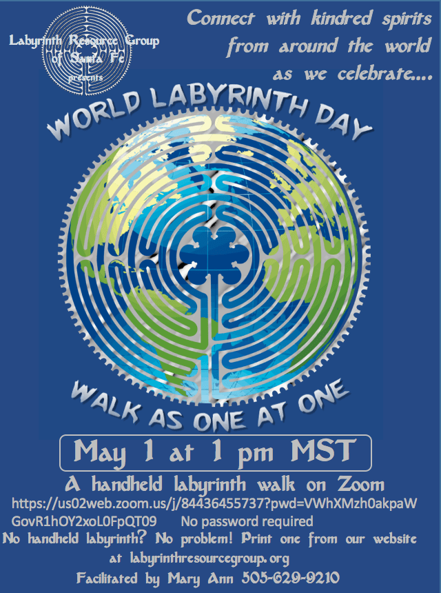 Celebrate World Labyrinth Day! May 1 April 26, 2021Labyrinth Resource Group of Santa Fe Leave a comment Log into Zoom at: https://us02web.zoom.us/j/84436455737?pwd=VWhXMzh0akpaWGovR1hOY2xoL0FpQT09 No password needed Share this: Click to share on X (Opens in new window) X Click to share on Facebook (Opens in new window) Facebook Like Loading... Related