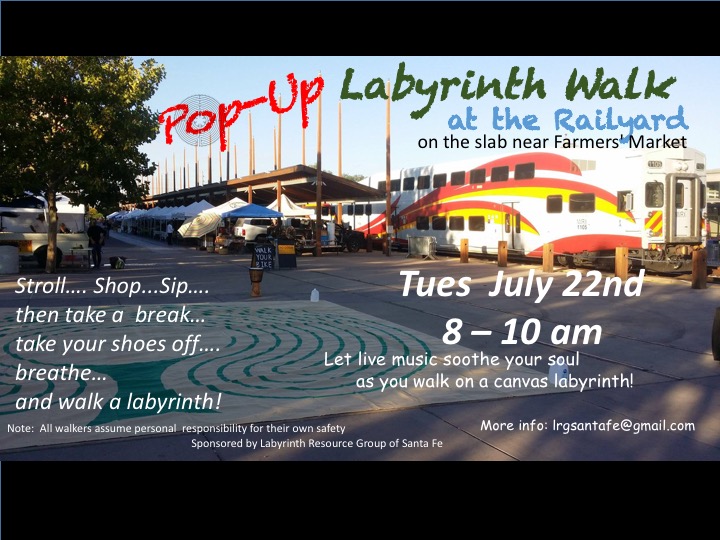 June 27, 2025Labyrinth Resource Group of Santa Fe Leave a comment Here is a unique experience….. walk a canvas labyrinth spread out on the slab at the Tuesday Farmers’ Market at the Railyard in Santa Fe on Tuesday, July 22 from 8-10 am! Share this: Click to share on X (Opens in new window) X Click to share on Facebook (Opens in new window) Facebook Like Loading... Related